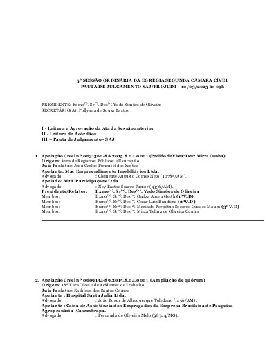 De ordem do Presidente da Egrégia Segunda Câmara Cível, Exmo. Sr. Des. Yedo Simões de Oliveira, comunicamos que a sessão do dia 15/12/2025 ocorrerá de forma PRESENCIAL no Auditório Desembargador Ataliba David Antônio - Plenário do Tribunal Pleno, localizado no térreo do Edifício Arnoldo Péres. Será admitido ao advogado com domicílio profissional em cidade diversa deste Tribunal de Justiça realizar sustentação oral por meio de videoconferência desde que o requeira até o dia útil anterior ao da sessão, nos termos do §4o do art. 937 do CPC, ressalvando-se que caso a parte esteja representada por mais de um advogado, apenas o impedimento de todos eles autoriza a sustentação por videoconferência ou adiamento da sessão, conforme previsto no §3o do art. 44 do Regimento Interno do Tribunal de Justiça do Estado do Amazonas (Resolução nº 62, de 287 de novembro de 2023). Os advogados com domicílio na cidade de Manaus deverão realizar a sustentação oral de forma presencial, salvo por justo motivo, devendo requerer a participação por vídeo diretamente ao Relator.
