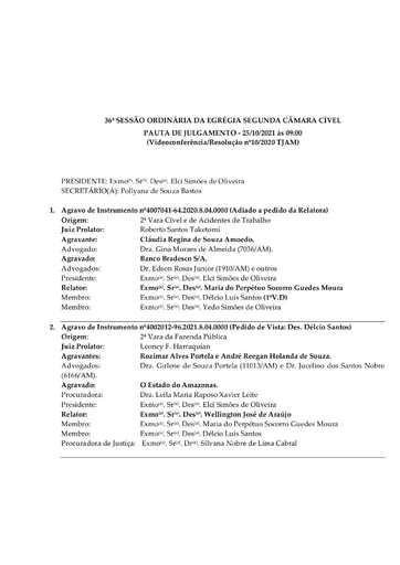 De ordem do Exmo. Sr. Desdor. Elci Simões de Oliveira, Presidente da Egrégia Segunda Câmara Cível, informamos que a inscrição para fins de sustentação oral deverá ser realizada, através de WhatsApp (92) 99617-7332, com antecedência mínima de 24 (vinte e quatro) horas úteis anteriores à realização da sessão (Parágrafo único da Portária nº 951, de 24 de abril de 2020), independentemente de peticionamento nos autos. Durante a realização da sessão não atenderemos solicitações. Informamos que os processos ADIADOS na Sessão do dia 04.10.2021 serão inseridos automaticamente na sessão posterior.