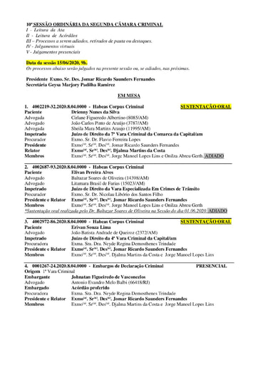 De ordem do Exmo. Sr. Des. Jomar Ricardo Saunders Fernandes - Presidente da 2ª Câmara Criminal, informamos aos advogados e público em geral que em conformidade com a Portaria 02/2020 do TJAM, as Sessões Presenciais da 2ª Câmara Criminal estão suspensas, inicialmente, pelo prazo de 15 dias.
