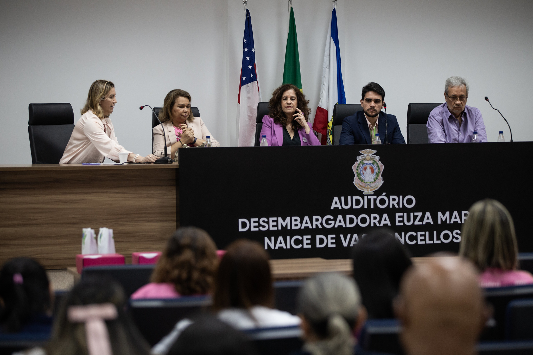 #PraTodosVerem: Imagem que ilustra a matéria traz a foto da mesa de autoridades da palestra de conscientização sobre câncer de mama e a prevenção e tratamento do câncer de colo do útero realizada no fórum Desembargadora Euza Naice.