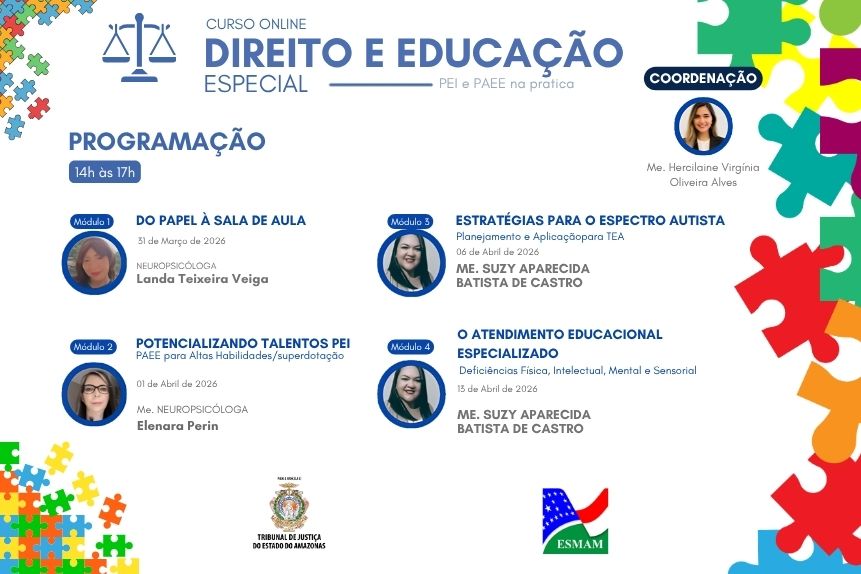 Logo após a abertura, os participantes já iniciarão o primeiro Módulo que tratará da "Estrutura do Judiciário Brasileiro e Amazonense", que será ministrada pelo Dr. Rodrigo Bastos; "Números e Estatísticas do Judiciário", ministrado pelo Dr. Ricardo Câmara, coordenador do Núcleo de Estatística e Acompanhamento de Metas do TJAM; "Graus, Competências e Recursos no Judiciário", ministrado pelo juiz de Direito auxiliar da corregedoria de Justiça do TJAM, Flávio Henrique Feitas; além disso, os participantes vão aprender em detalhes como consultar os sistemas de gestão processual (SAJ e Projud), com o Dr. Thiago Facundo, diretor de Tecnologia da Informação do TJAM.