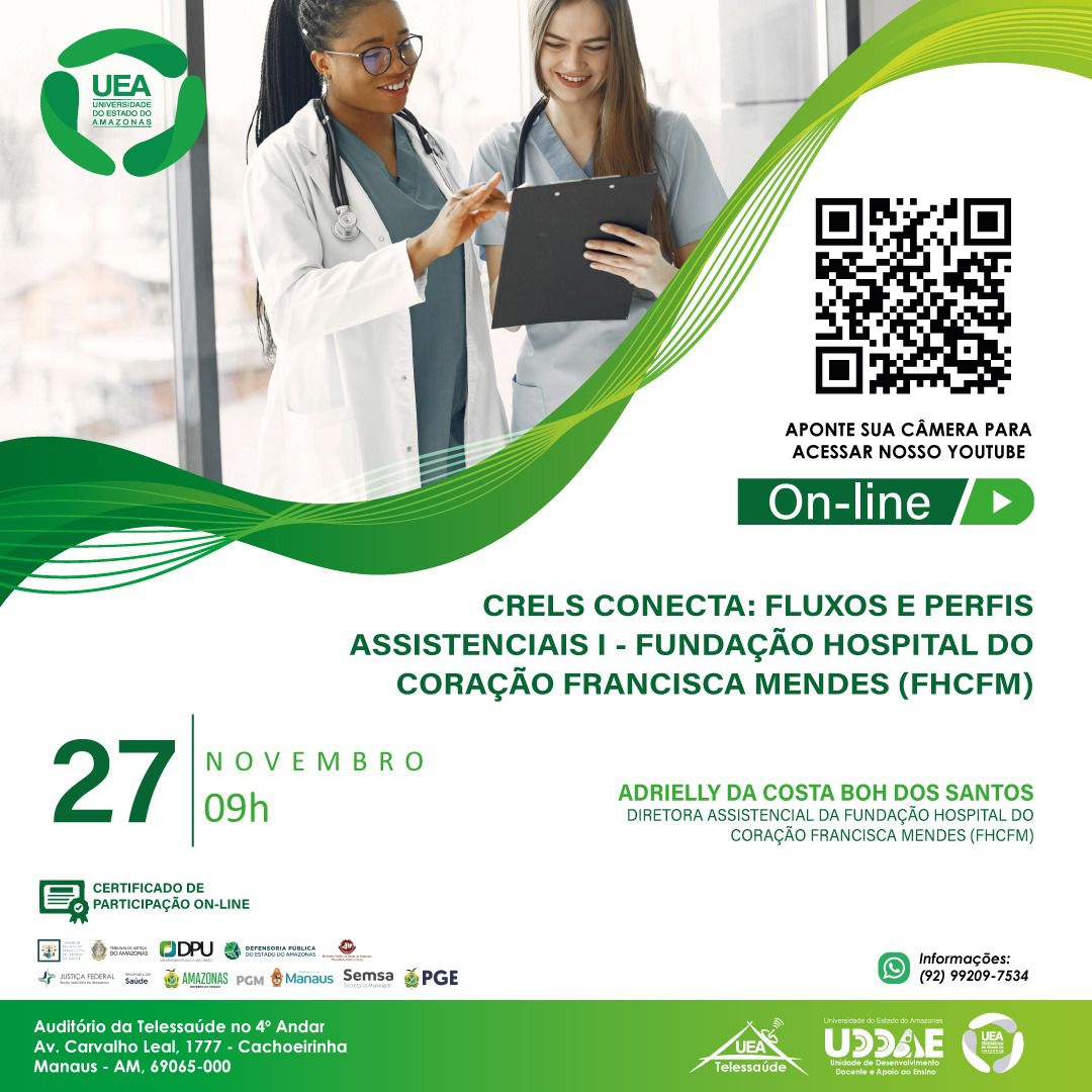 Data: 27/11/2025 - QUINTA-FEIRA Horário: 09h Tema: Fluxos e Perfis Assistenciais I - Fundação Hospital do Coração Francisca Mendes (FHCFM). Plataforma: _YouTube_ Link: https://www.youtube.com/watch?v=CC1Fu8z9FDs Obs.: Os participantes receberão certificados através do _e-mail_ informa...