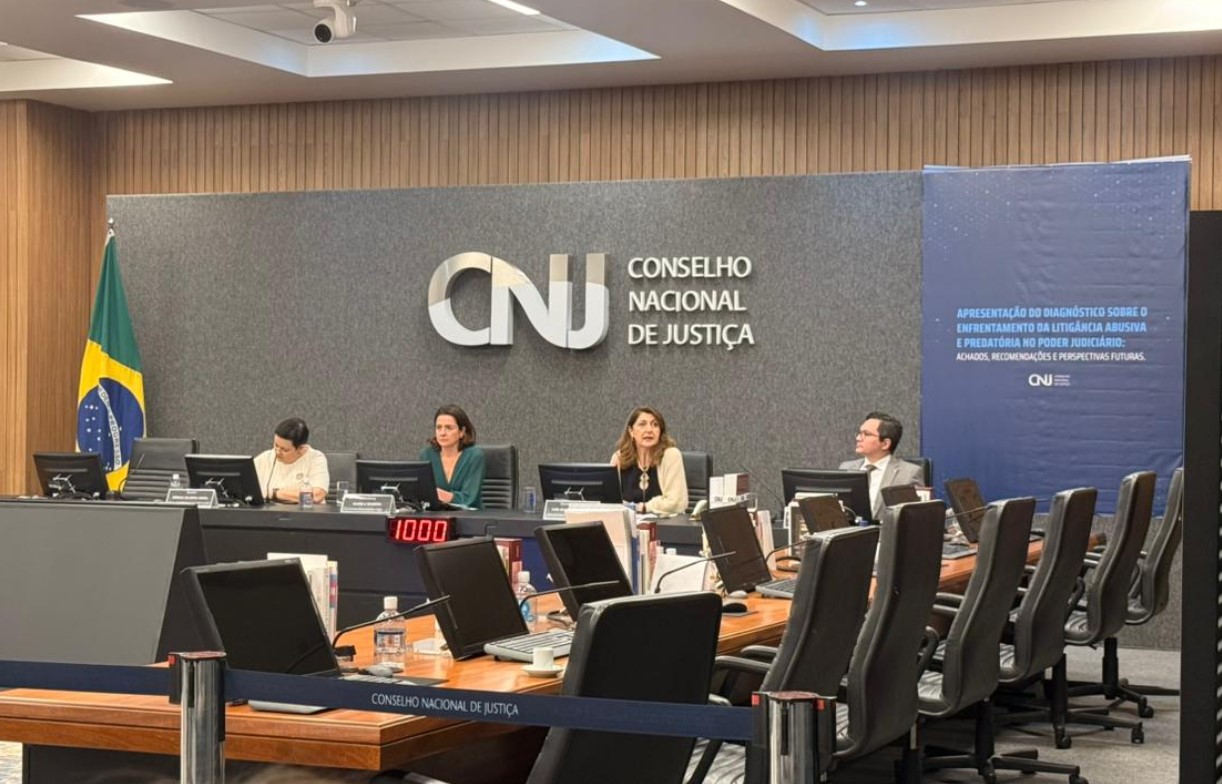 #PraTodosVerem: Na imagem principal que ilustra a matéria, o registro fotográfico da reunião de “Apresentação do Diagnóstico sobre o Enfrentamento da Litigância Abusiva e Predatória do Poder Judiciário: Achados, Recomendações e Perspectivas Futuras” , na sede do CNJ em Brasília. Na mesa, da esquerda pra direita, estão um homem de cor branca, cabelo preto e roupa bege; duas mulheres de cor branca, cabelos castanhos e loiro, vestidas de verde e bege, respectivamente; e um homem de cor branca, cabelo preto, vestido de terno na cor cinza e camisa branca. A reunião ocorre em um auditório com a logo do CNJ ao fundo em uma parede cinza, com painel azul e uma bandeira do Brasil. Fim da descrição.