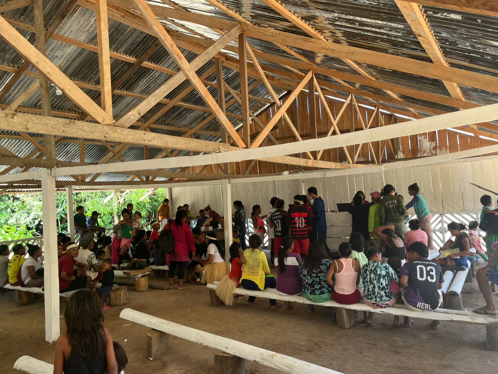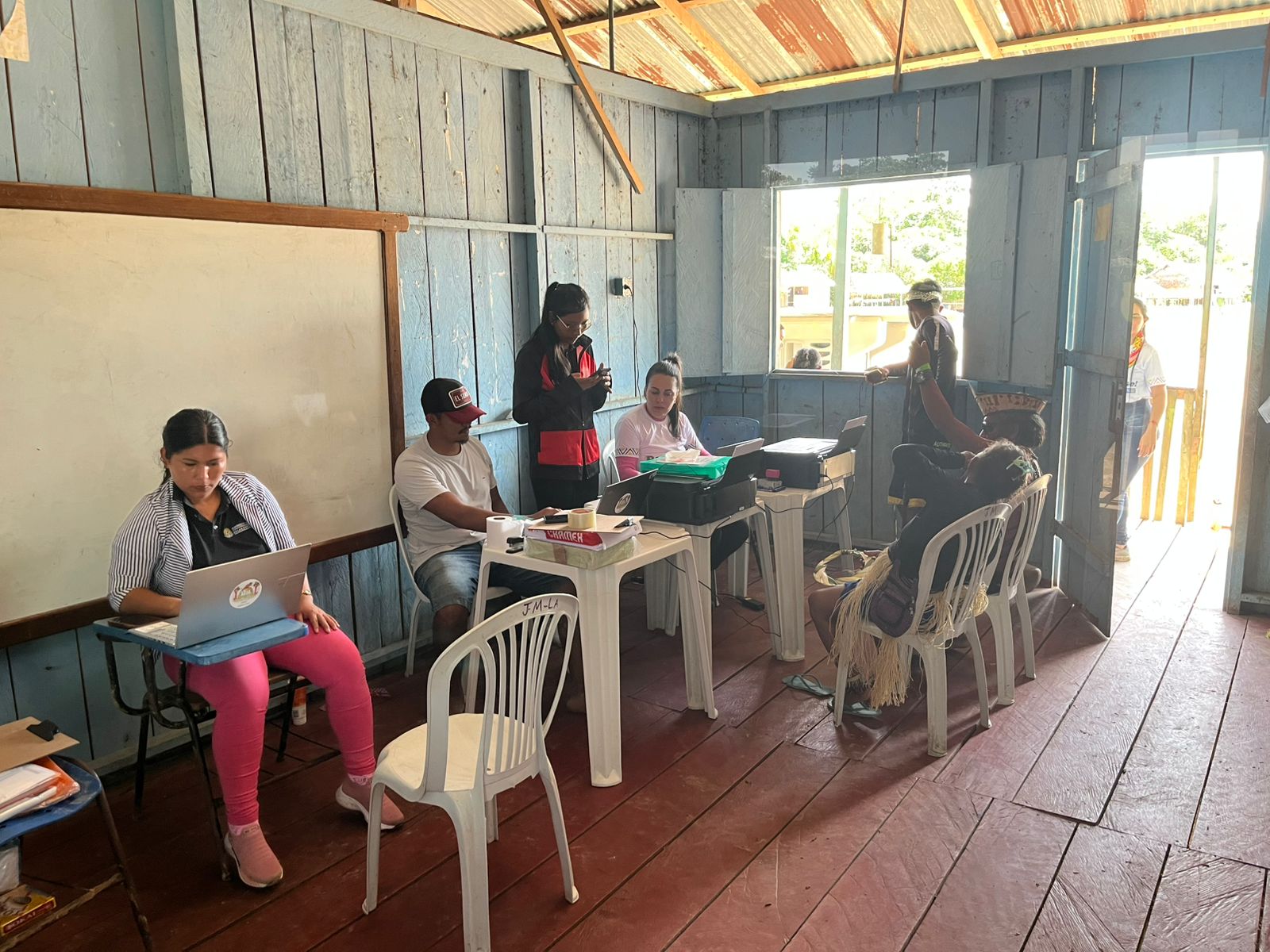 #PraTodosVerem: Fotografia em ambiente rústico mostra atendimento realizado em uma comunidade, dentro de uma construção de madeira com paredes claras e cobertura de telhas metálicas. Ao centro, há uma mesa grande de madeira sobre a qual estão espalhados documentos, formulários, carimbos, materiais de escritório e um computador portátil. Duas mulheres realizam o atendimento, uma delas utilizando máscara, enquanto conversam com uma mulher sentada que segura uma criança no colo. Ao redor da mesa, há homens, mulheres e crianças observando e aguardando, alguns sentados em cadeiras plásticas e outros apoiados na estrutura de madeira. Ao fundo, é possível ver vegetação densa, indicando área rural. O ambiente é iluminado pela luz natural que entra pelas laterais abertas da construção.