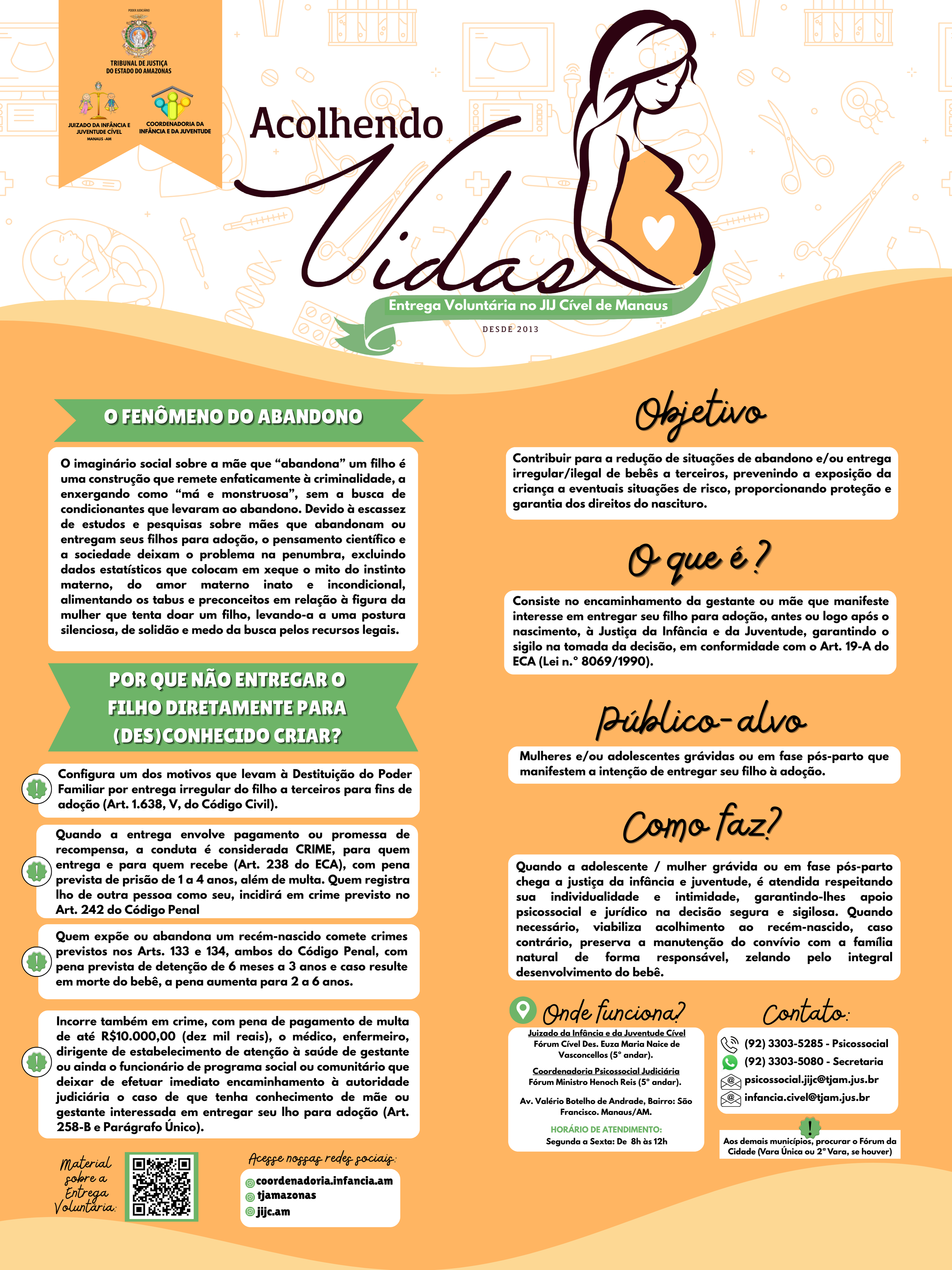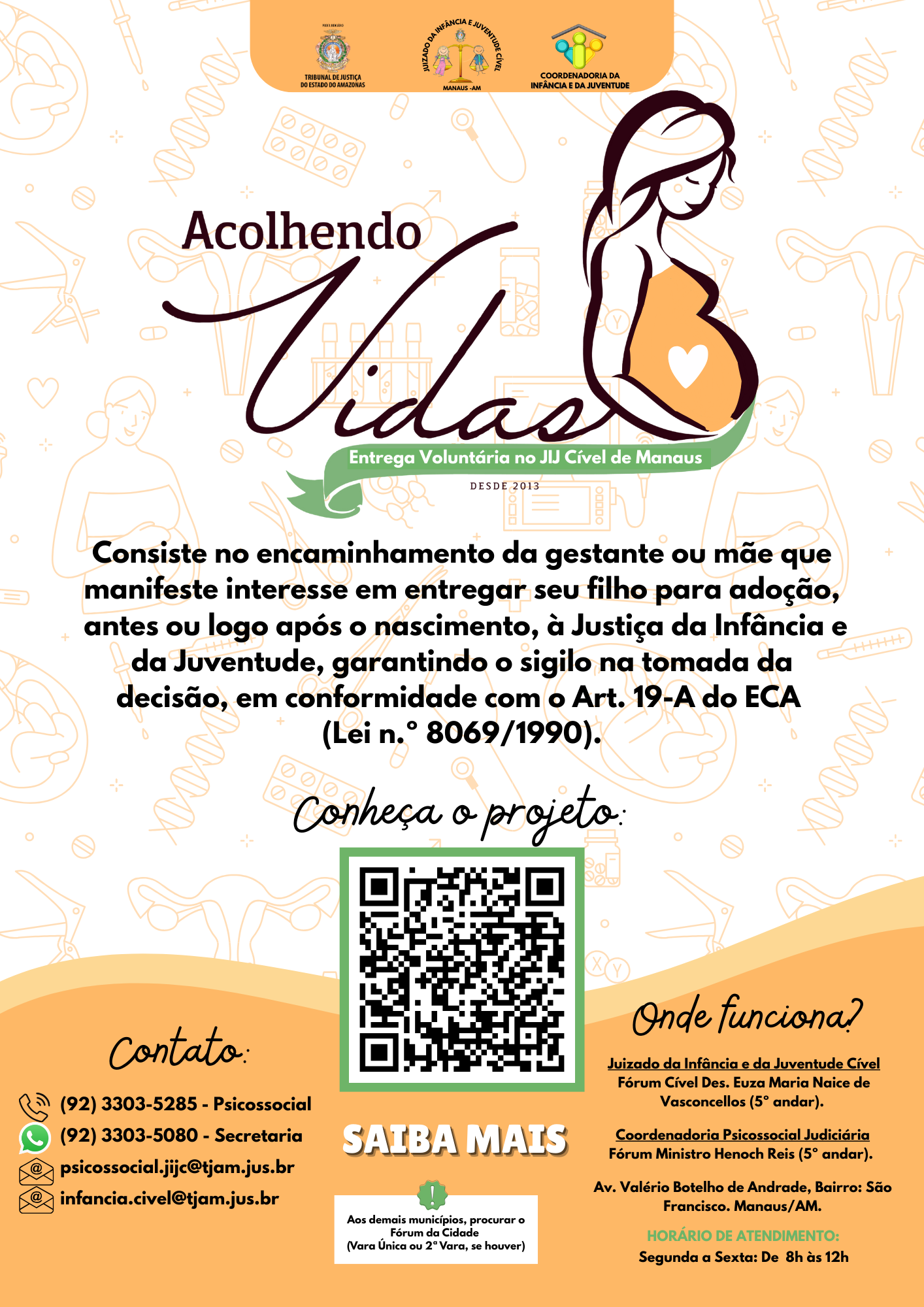 A partir da demanda consolidada em processo no Juizado da Infância e Juventude Cível, são identificados casos de entrega e recebimento irregulares de crianças, abandono de recém-nascidos em maternidades e lugares ermos, mulheres grávidas que procuram a Justiça acompanhadas de candidatos a pai não habilitados legalmente. Essas práticas em total dissonância com a legislação em vigor são a motivação para implementação do Projeto Acolhendo Vidas, visto a presente necessidade de regulamentar procedimentos, envolvendo a rede de atenção maternoinfantil, o esclarecimento e a conscientização das gestantes e da sociedade em geral acerca desta problemática que poderá culminar com a geração de ação criminal em relação a agentes públicos e a pessoas eventualmente partícipes da ocorrência.
