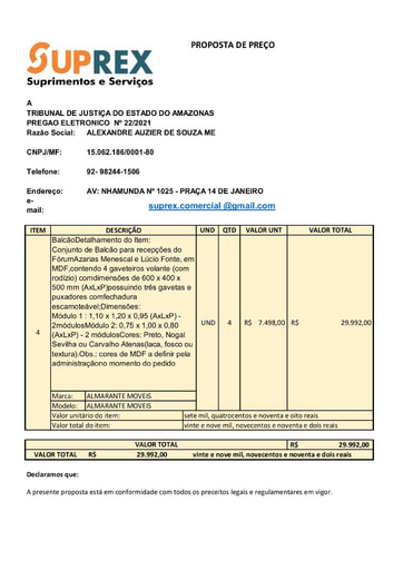 OBJETO: Registro de Preços para eventual fornecimento de Balcões de Recepções para atender ao Tribunal de Justiça do Estado do Amazonas - TJAM, por um período de 12 (doze) meses.