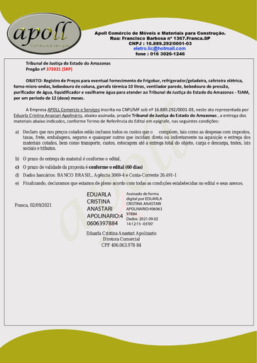 OBJETO: Registro de Preços para eventual fornecimento de Frigobar, refrigerador/geladeira, cafeteira elétrica, forno micro-ondas, bebedouro de coluna, garrafa térmica 10 litros, ventilador parede, bebedouro de pressão, purificador de água, liquidificador e vasilhame água para atender ao Tribunal de Justiça do Estado do Amazonas - TJAM, por um período de 12 (doze) meses.