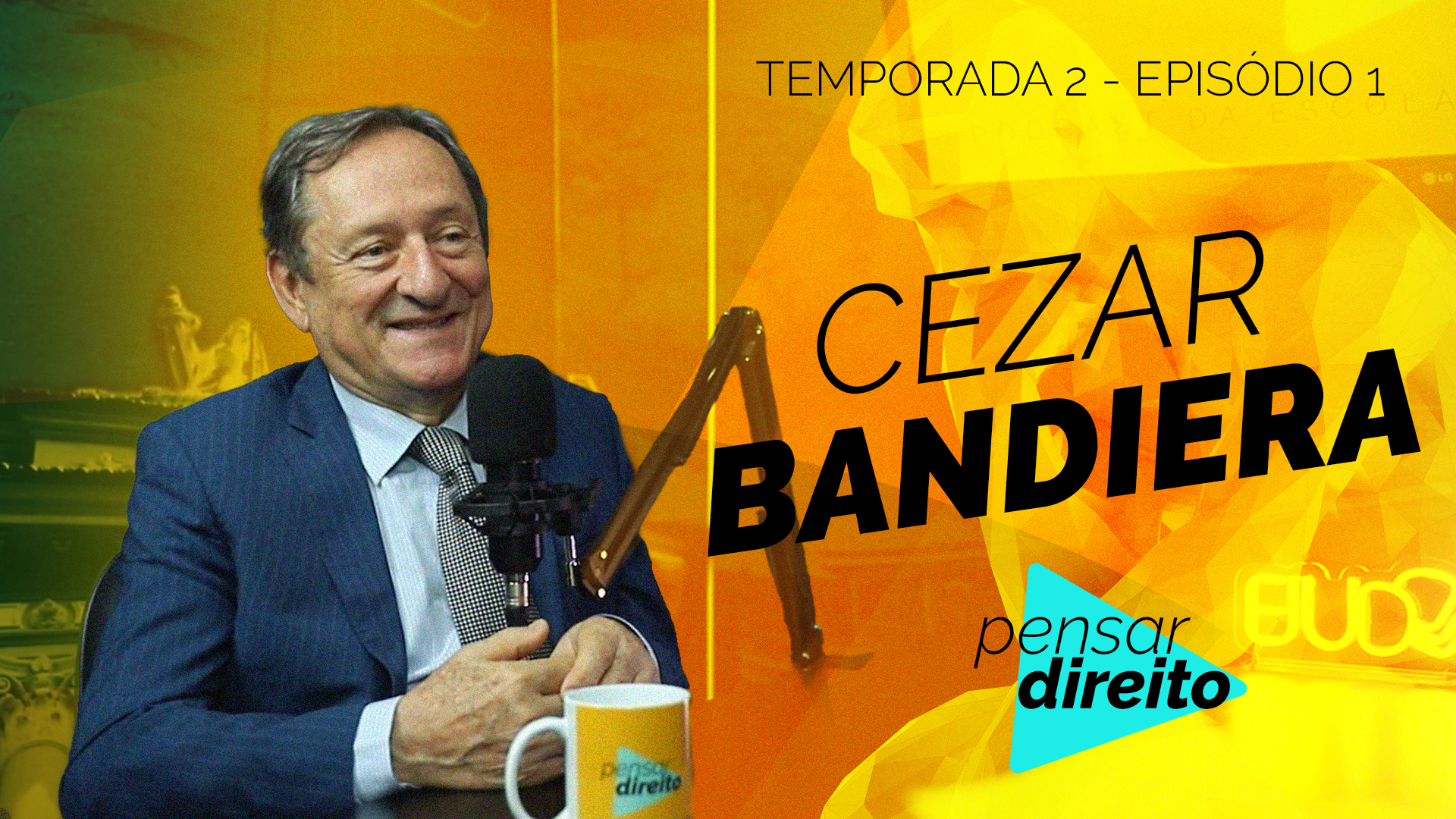 #ParaTodosVerem: A colagem digital que ilustra a matéria mostra o desembargador Cezar Bandiera, à esquerda, sorrindo. A sua frente está o microfone típico de podcasts. A direita da imagem, sobre um fundo amarelo estilizado com a estátua "O pensador", se lê em três linhas: "Temporada 2, Episódio 1. Cezar Bandiera". Como assinatura, logo abaixo está a logomarca do programa Pensar Direito.