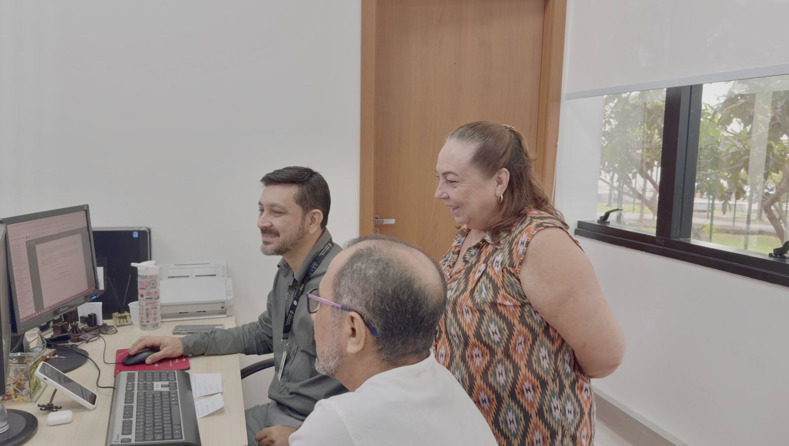 #ParaTodosVerem: A foto que ilustra a matéria mostra o instrutor Elieder sentado ao lado de um servidor e de uma servidora, utilizando um computador.