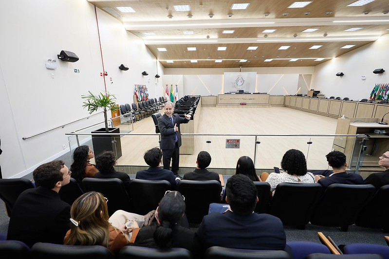 Após a palestra, os estudantes visitaram o Tribunal Pleno, acompanhados do desembargador Délcio Luís Santos, que compartilhou experiências sobre o início da carreira no Direito e diversos aspectos da jurisdição.