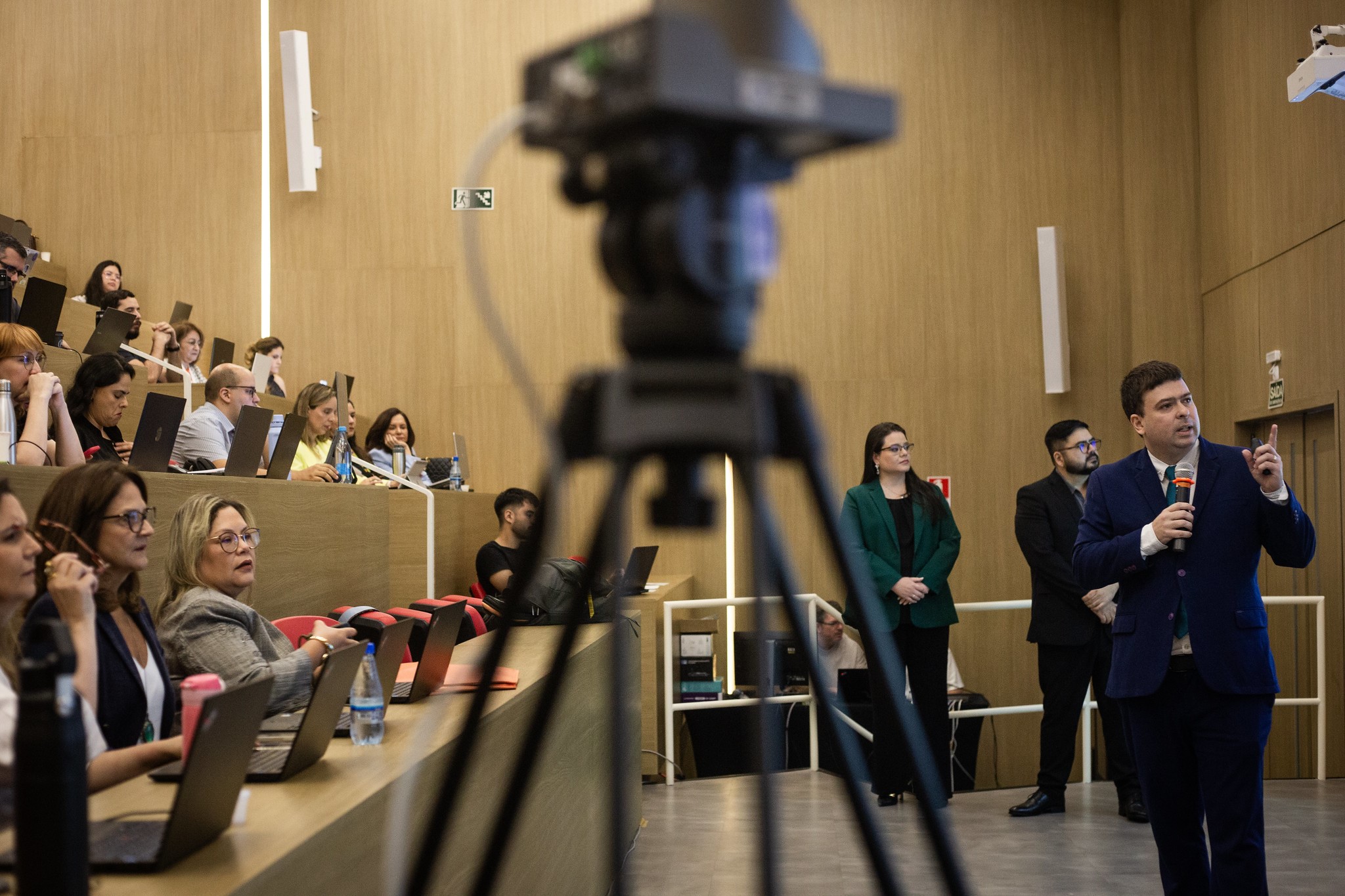 #PraTodosVerem - a fotografia principal que ilustra a matéria mostra o juiz Igor Campagnolli ministrando uma das aulas durante o curso de capacitação. Ele está em pé diante da plateia formada por juízes e servidores, usa terno azul-marinho e fala ao microfone. Logo atrás do magistrado, também em pé, estão os dois outros instrutores da capacitação, Juliana Najara e Rhedson Esashika.