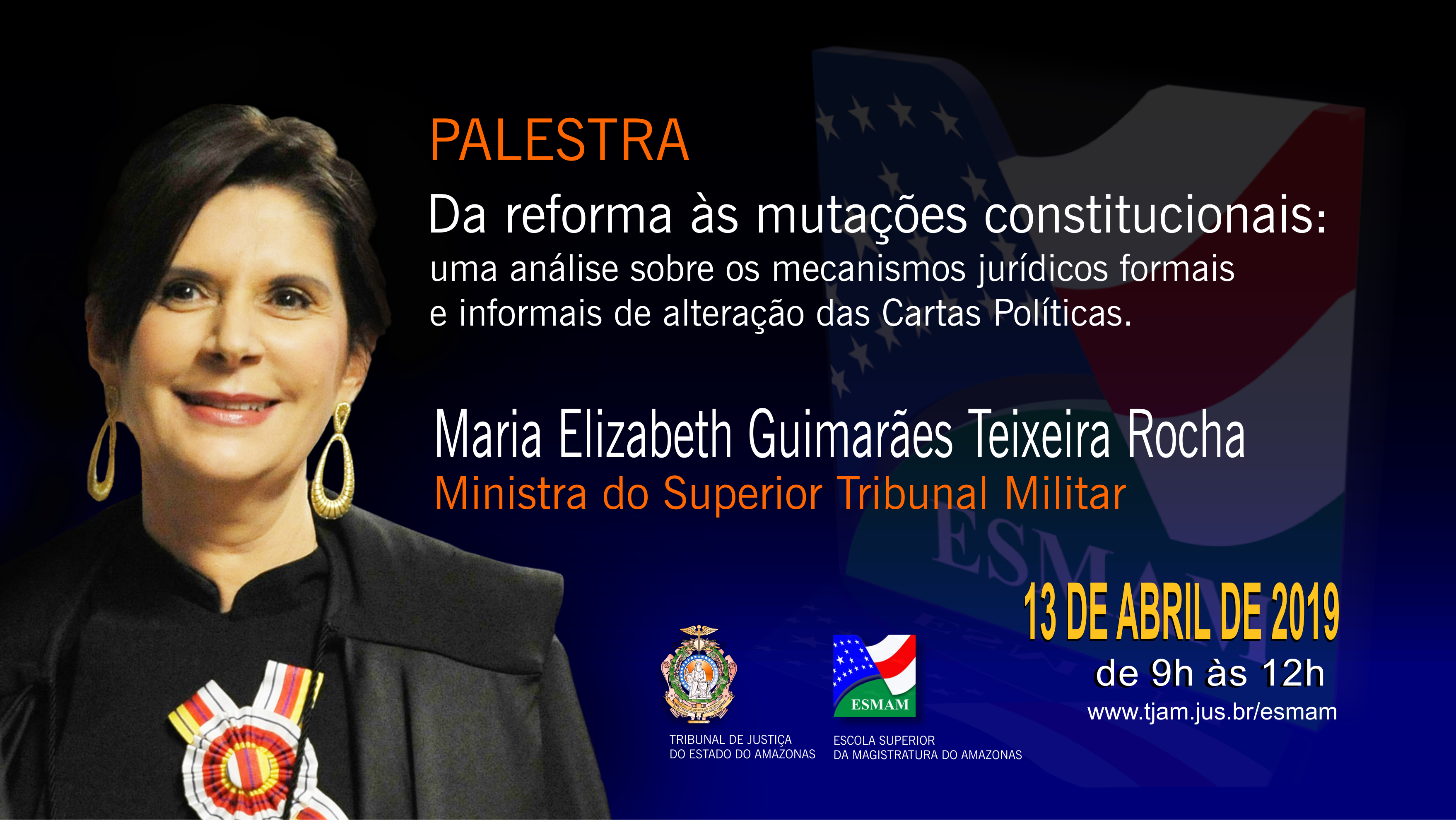 Manaus (AM) - A ministra Maria Elizabeth Guimarães Teixeira Rocha, do Superior Tribunal Militar (STM), irá proferir palestra, em Manaus, no próximo dia 13, com o tema “Da reforma às mutações constitucionais; uma análise sobre os mecanismos jurídicos formais e informais de alteração das Cartas Políticas”. O evento ocorrerá no sábado, das 9h às 12h, no auditório do Centro Administrativo Desembargador José Jesus Ferreira Lopes, prédio anexo à sede do Tribunal de Justiça do Amazonas (TJAM).