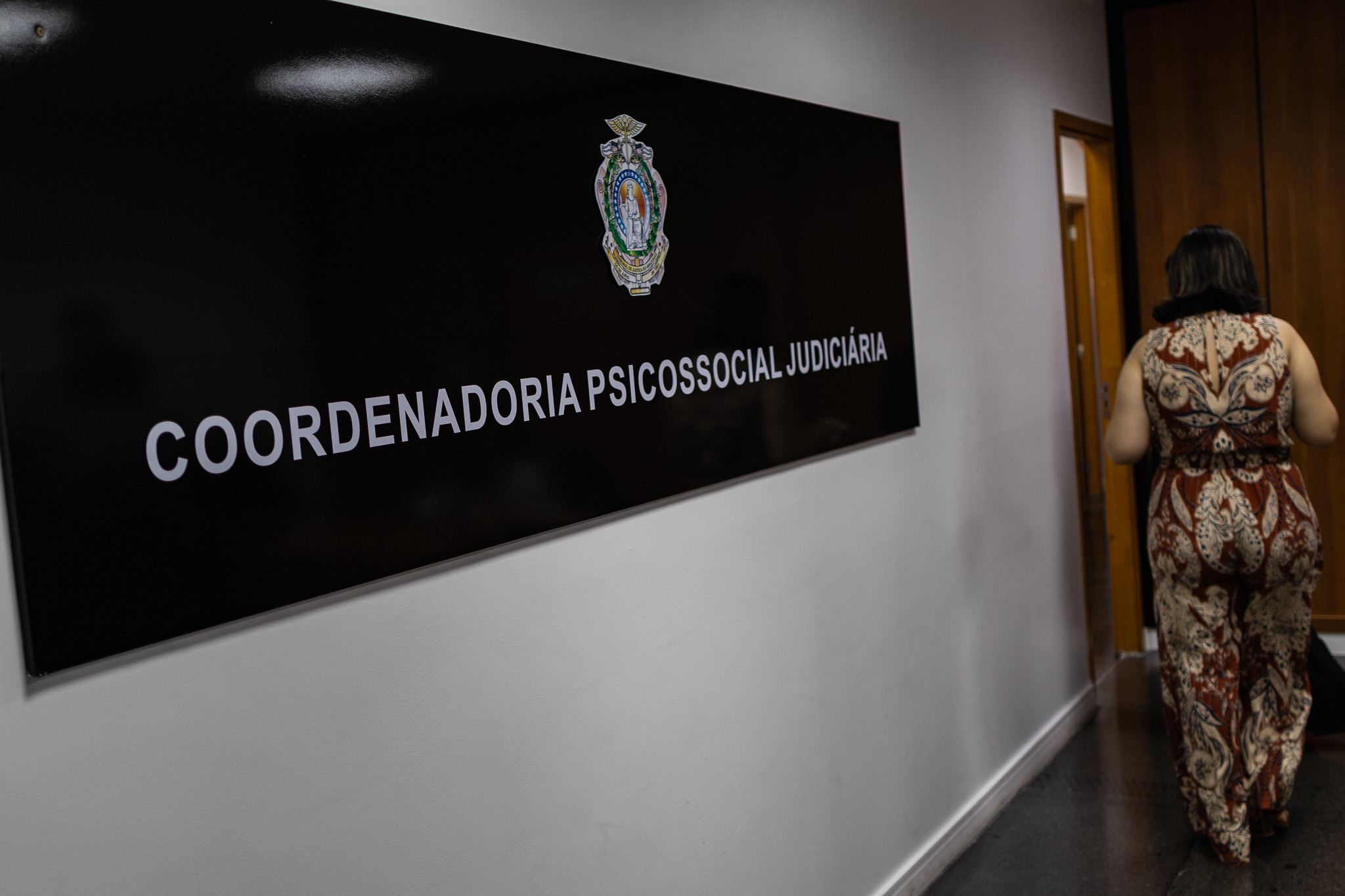 #ParaTodosVerem: A fotografia que ilustra a matéria mostra, em destaque, um painel (de fundo preto), afixado na parede, com a inscrição (em letras brancas): "Coordenadoria Psicossocial Judiciária". Acima dos dizeres está o brasão do Tribunal de Justiça do Amazonas. Do lado direito da imagem, uma mulher aparece de costas caminhando em direção a uma porta que está no final do corredor.