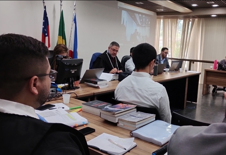 #PraTodosVerem: Imagem que ilustra a matéria traz a foto, ao centro, do juiz de direito titular da 2.ª Vara do Tribunal do Júri, Fábio Lopes Alfaia, durante julgamento realizado no Fórum de Justiça Ministro Henoch Reis, no bairro São Francisco, zona Sul. Na fotografia aparecem representantes do Ministério Público do Estado, defesa, servidores do Poder Judiciário e um dos réus (de costas)