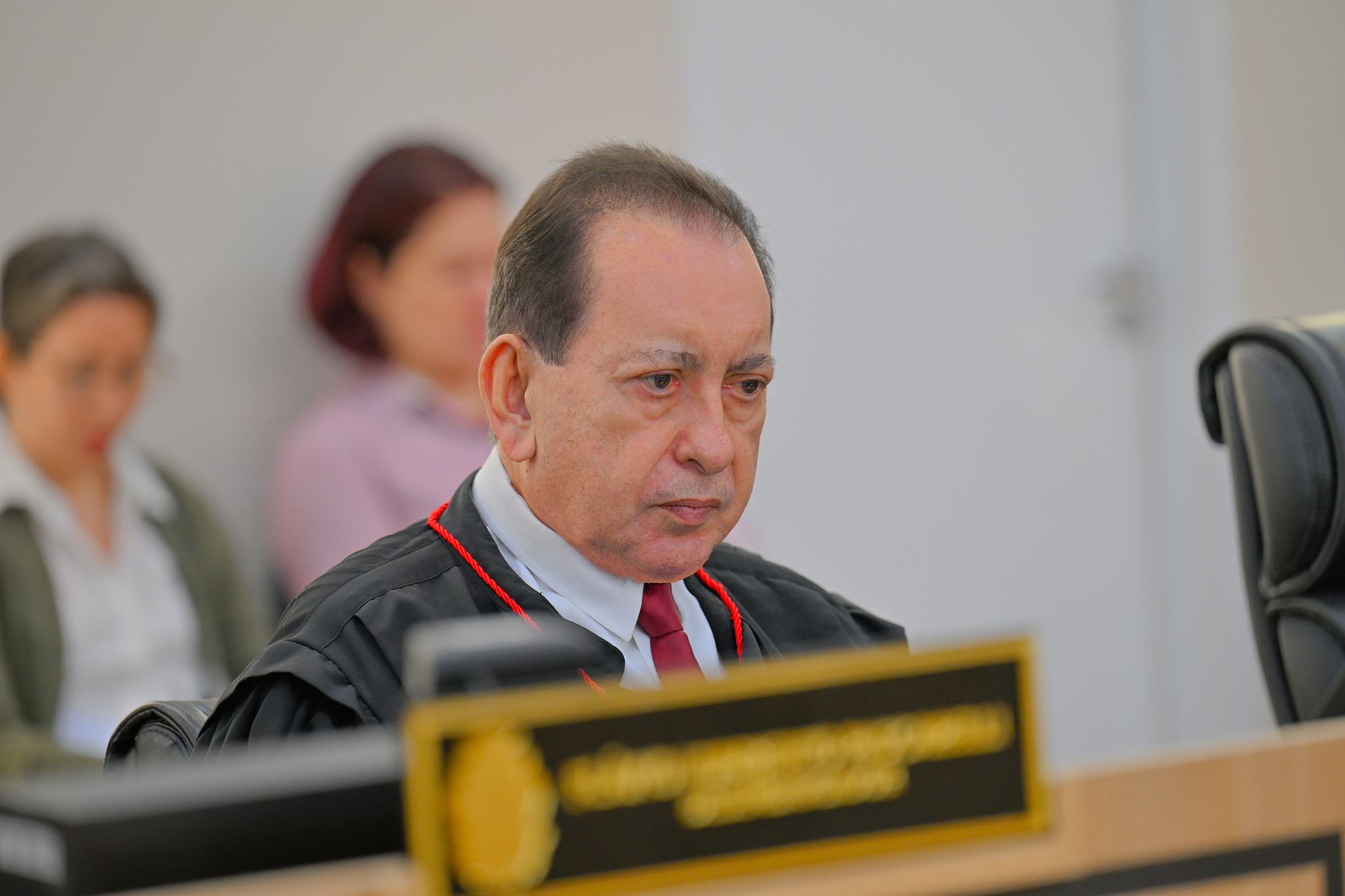 #PraTodosVerem - A fotografia colorida que ilustra a matéria mostra o desembargador Yedo Simões, relator do processo, durante sessão do Pleno. Ele usa toga preta com um cordão vermelho pendendo da gola sobre terno e gravata.