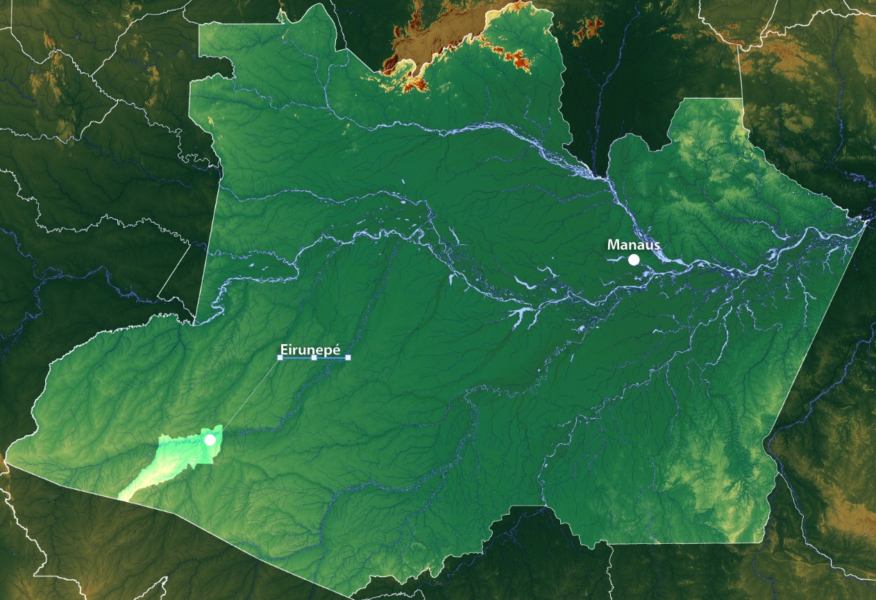 #PraTodosVerem: Imagem que ilustra a matéria traz uma arte com o desenho do Estado do Amazonas, assinalando as cidades de Manaus e de Eirunepé