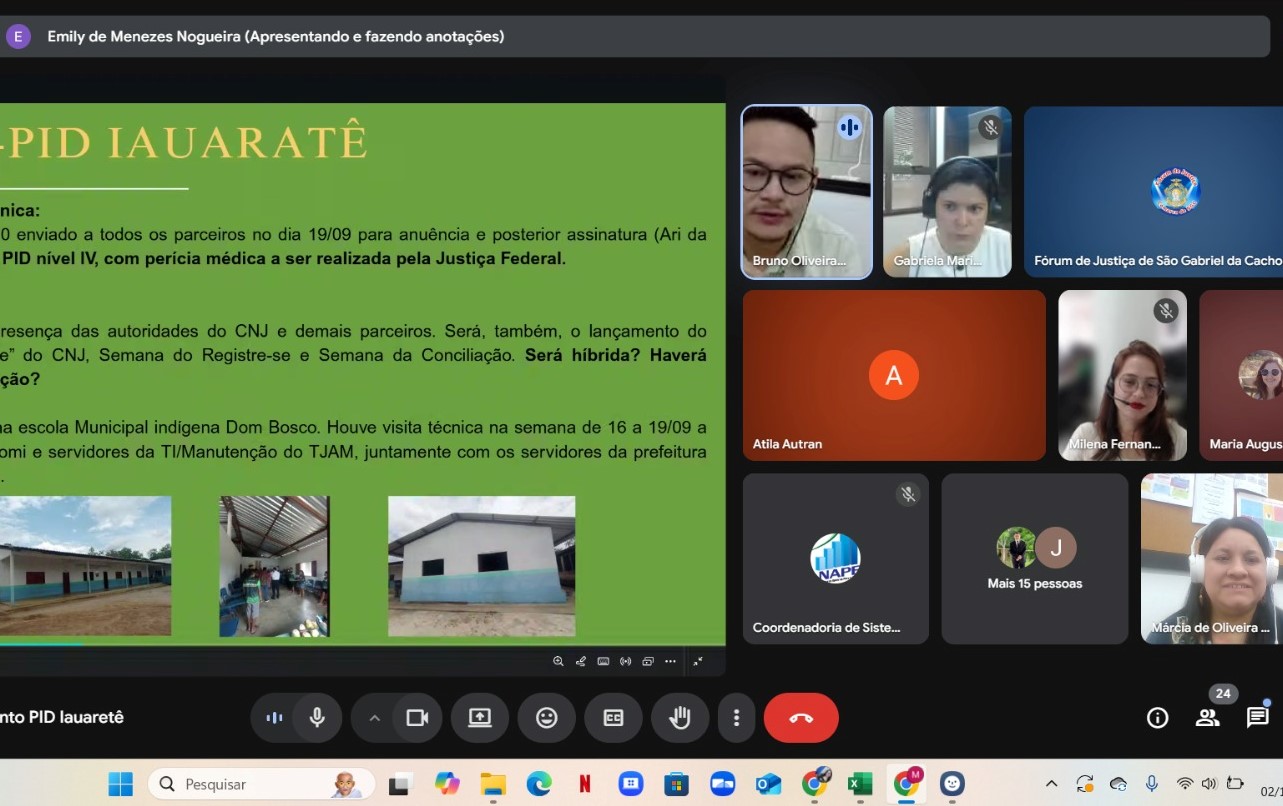 Nesta quinta-feira (2/10), representantes dos órgãos parceiros se reuniram para alinhar os últimos preparativos da inauguração. Em formato virtual, teve a participação do juiz Roberto Taketomi; do juiz titular da Vara Única da Comarca de São Gabriel da Cachoeira, Manoel Átila Araripe Autran Nunes; e de representantes das instituições parceiras – Prefeitura Municipal de São Gabriel da Cachoeira; Cartório Extrajudicial de São Gabriel da Cachoeira; Justiça Federal de 1.º Grau/Seção Judiciária do Amazonas (SJAM); Tribunal Regional Eleitoral do Amazonas (TRE/AM); Tribunal Regional do Trabalho da 11.ª Região AM/RR (TRT11); Defensoria Pública do Estado do Amazonas (DPE/AM); Ministério Público do Estado do Amazonas (MPAM); Ordem dos Advogados do Amazonas, Seccional Amazonas (OAB/AM); e Fundação Nacional dos Povos Indígenas/Coordenação Regional Rio Negro (Funai C. R. Rio Negro).