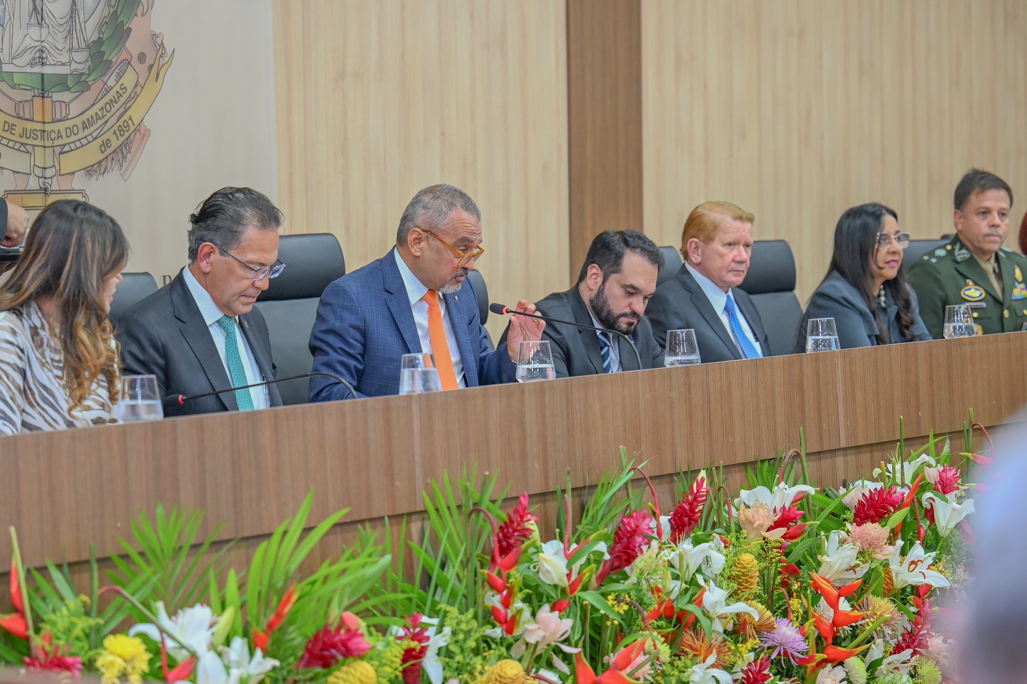 #PraTodosVerem: A matéria possui várias fotos de momentos da cerimônia de abertura, mostrando plateia, autoridades e discursos. A imagem que abre o texto traz uma visão geral da cerimônia com parte da plateia observando as autoridades que estão ao fundo, sentadas, em bancadas próprias - no formato de U –, defronte aos presentes. São mais de 20 autoridades, todas formalmente vestidas, com o presidente da Corte e o ministro no centro da bancada, que tem à frente arranjos de folhagens e flores tropicais no chão. Ao fundo, paredes com revestimento bege e detalhes em madeira, com boa iluminação, e o brasão do Tribunal de Justiça do Amazonas dominando a parede central. Ao lado esquerdo, é possível ver três bandeiras (do Amazonas, do Brasil e do Poder Judiciário). Ao lado direito da imagem, aparece um telão com identificação do evento e pessoas da parte técnica. Fim da descrição.