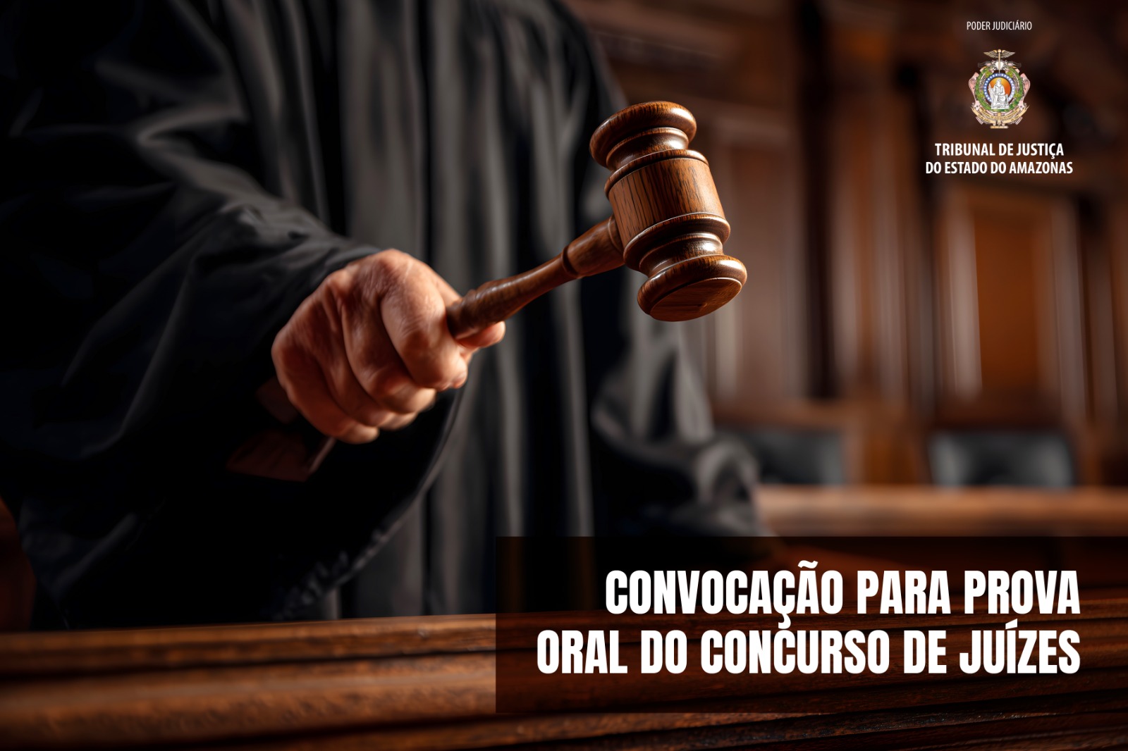 #PraTodosVerem: A imagem mostra a mão de uma pessoa vestida com uma toga judicial segurando um martelo de juiz, prestes a bater sobre a base de madeira. O cenário é um ambiente típico de tribunal, com móveis de madeira e iluminação suave ao fundo, reforçando o clima formal e solene da Justiça. No canto superior direito aparece o brasão do Tribunal de Justiça do Estado do Amazonas, acompanhado do texto “Poder Judiciário – Tribunal de Justiça do Estado do Amazonas”. Na parte inferior direita, em destaque sobre um fundo escuro translúcido, está o texto: “CONVOCAÇÃO PARA PROVA ORAL DO CONCURSO DE JUÍZES”.