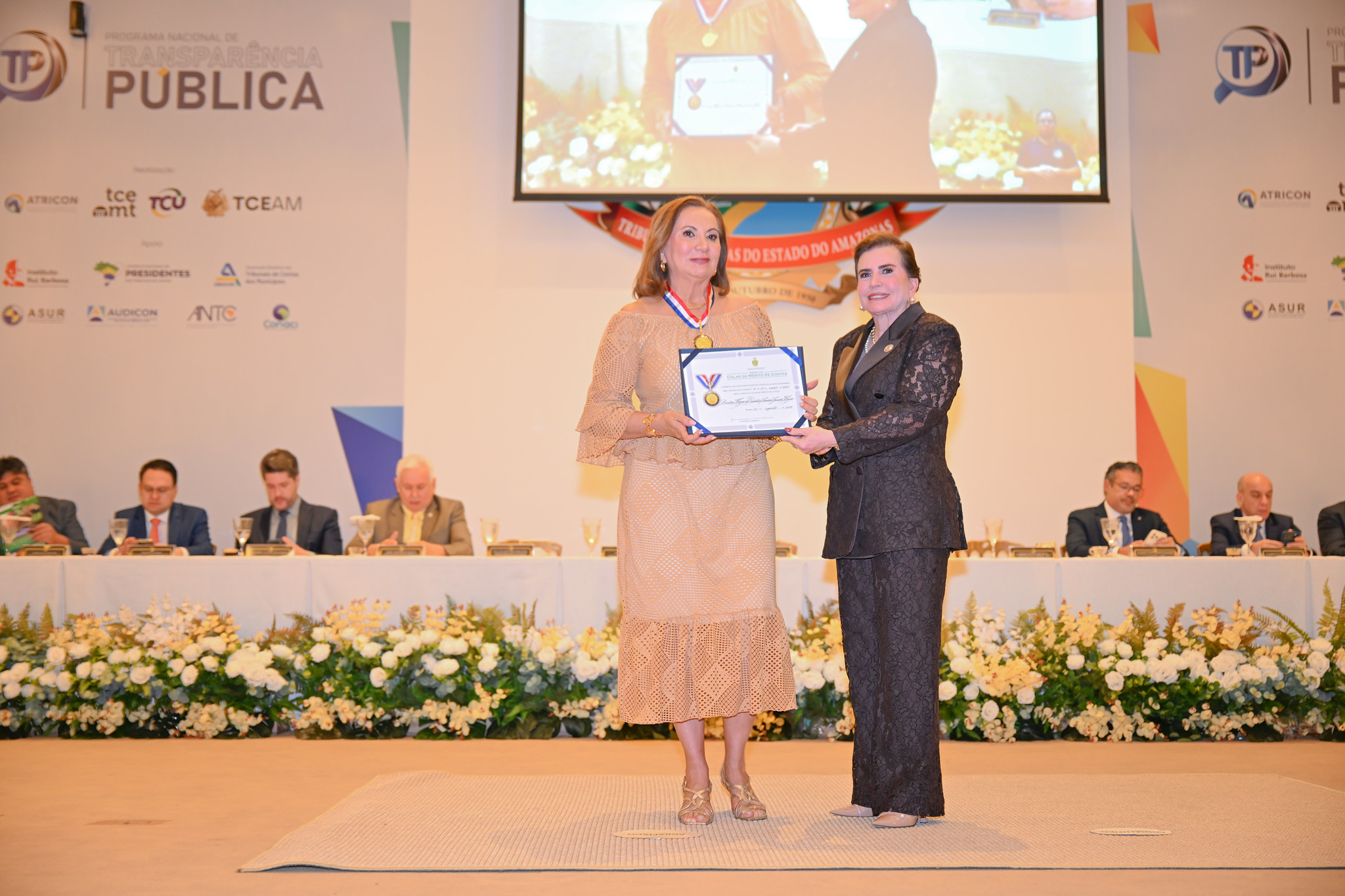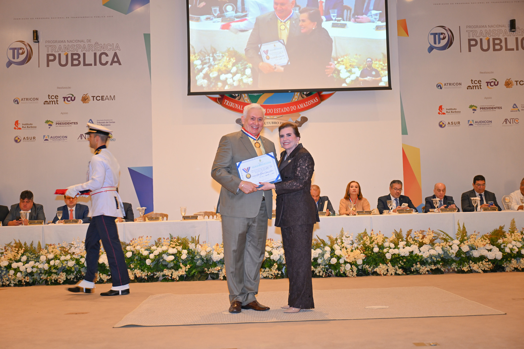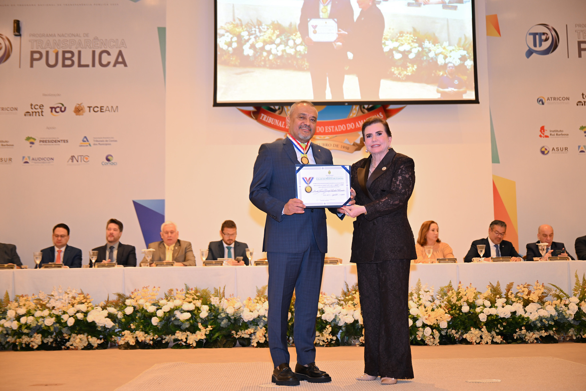 #PraTodosVerem - a fotografia principal que ilustra a matéria mostra o presidente do TJAM, desembargador Jomar Fernandes, recebendo das mãos da conselheira Yara Lins o troféu (em acrílico transparente) referente ao Selo Diamante consquistado pelo TJAM referente aos indicadores atingidos no âmbito do Programa Nacional de Transparência Pública (PNTP). Jomar veste um terno azul e Yara usa blazer de mangas longas e calça comprida, com detalhes em renda, na cor preta. Eles sorriem para a câmera. Ao fundo, é possível ver algumas das autoridades que compuseram o dispositivo de honra da solenidade batendo palmas. Na parte superior direita da imagem, vê-se detalhe do brasão do TCE/AM.