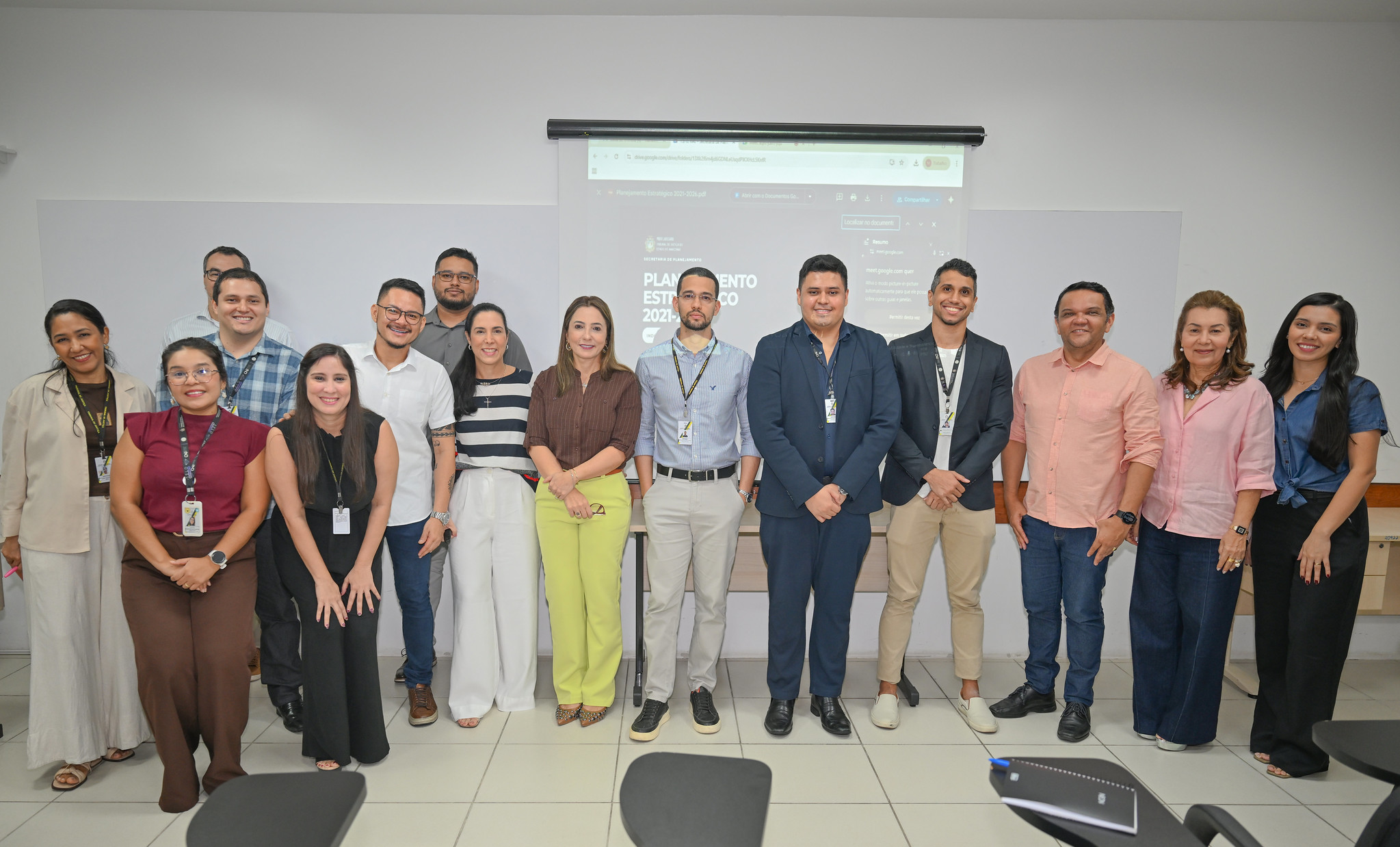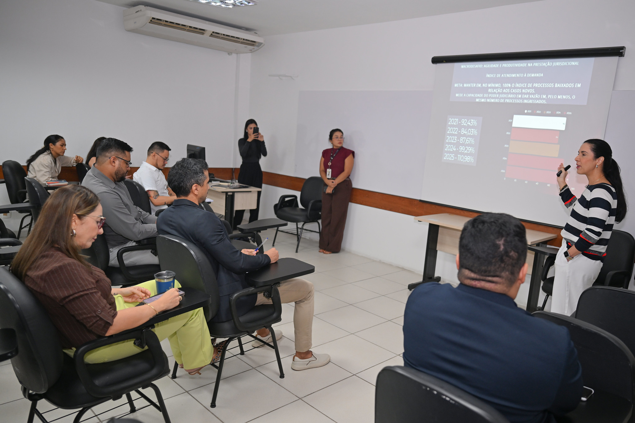 #PraTodosVerem - a fotografia principal que ilustra a matéria mostra servidores do TJAM participando da reunião com a equipe da área de Planejamento sobre os resultados dos indicadores do plano estratégico de 2021/2026 e as diretrizes sobre o planejamento para o sexênio 2027/2032. À direita na imagem, a servidora Maria Eleonora Brandao Castelo Branco aparece em pé, durante a exposição dos dados. Ela usa camisa de mangas compridas na cor branca, com listras pretas largas e alguns detalhes em vermelho. Ao fundo, projetado na parede, um painel com dados estatísticos e gráficos.