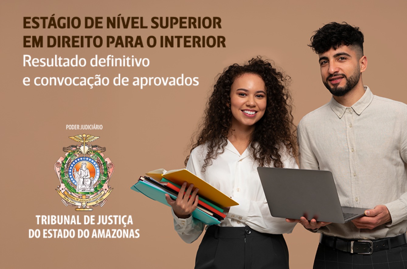 #PraTodosVerem - a imagem que ilustra a matéria mostra dois jovens (uma moça e um rapaz) sorridentes e traz a traz a informação: Estágio de Nível Superior em Direito para o Interior - Resultado definitivo e convocação de aprovados. Logo abaixo desses dizeres, está o brasão do Tribunal de Justiça do Amazonas. A moça tem os cabelos longos e encaracolados; usa blusa branca de mangas compridas e calça do tipo social na cor cinza; e está carregando cadernos e pastas de documentos. O rapaz, que usa o cabelo raspado na base e mais longos na parte superior da cabeça, também está vestido formalmente, com uma camisa de punho, calça cinza com detalhes em xadrex e cinto escuro. Ele tem às mãos um notebook.