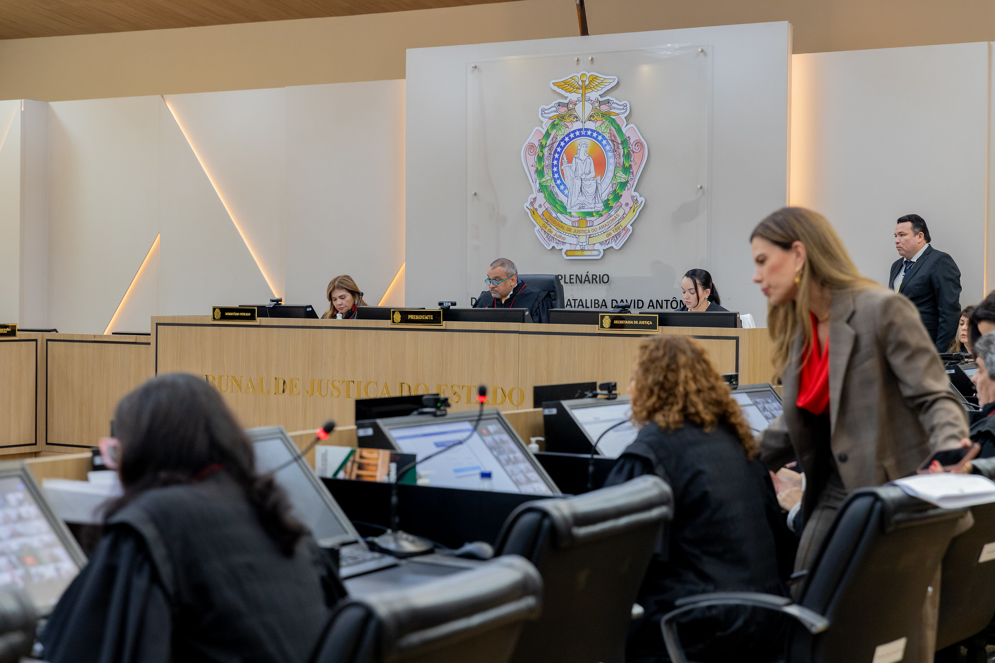 #PraTodosVerem - a fotografia principal que ilustra a matéria mostra o Plenário Des. Ataliba David Antonio, durante a Abertura do Ano Judiciário. Feita a partir da plateia, a foto mostra algumas pessoas de costas, sentadas nas cadeiras desse espaço. Elas acompanham a exposição de um advogado que aparece em pé diante do parlatório (espécie de púlpito usado para as sustentações orais durante os julgamentos). Usando uma beca preta comprida, o advogado também aparece de costas para a plateia. Mais ao fundo, estão os membros do Tribunal Pleno, que usam togas pretas. Eles ocupam lugares em duas bancadas laterais, enquanto o presidente da Corte, a representante do Ministério Público e a secretária-geral de Justiça estão sentados na bancada central, que fica próxima à parede. O ambiente é amplo e bastante iluminado, marcado pelo tom de madeira clara do mobiliário e do teto.