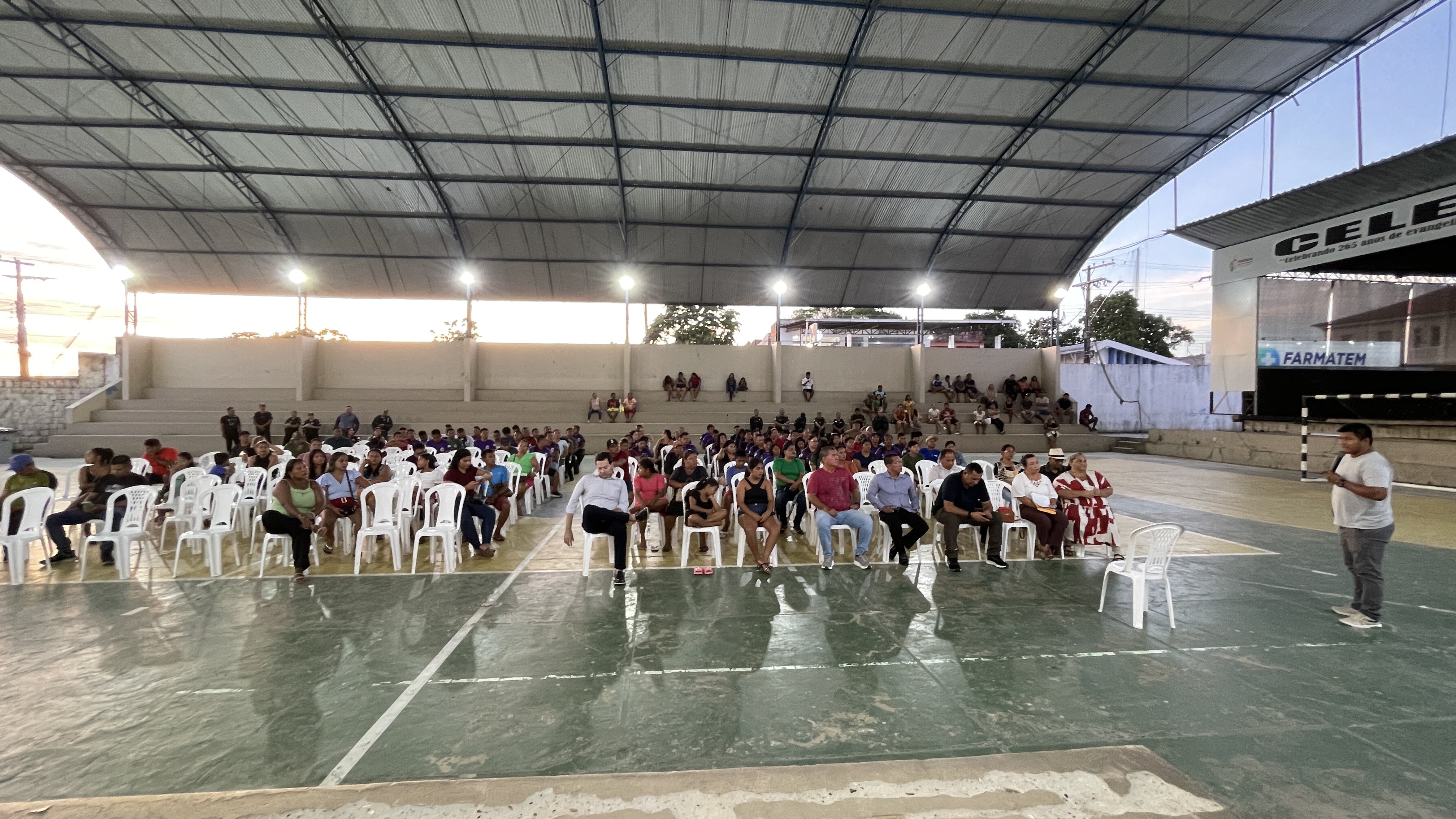 #PraTodosVerem - a fotografia principal que ilustra a matéria mostra o juiz Manoel Átila (em pé, falando ao microfone) durante a audiência pública. Diante dele, as pessoas da comunidade estão sentadas (a maioria delas em cadeiras, e outras espalhadas pelos demais espaços da quadra do ginásio onde ocorreu o evento).