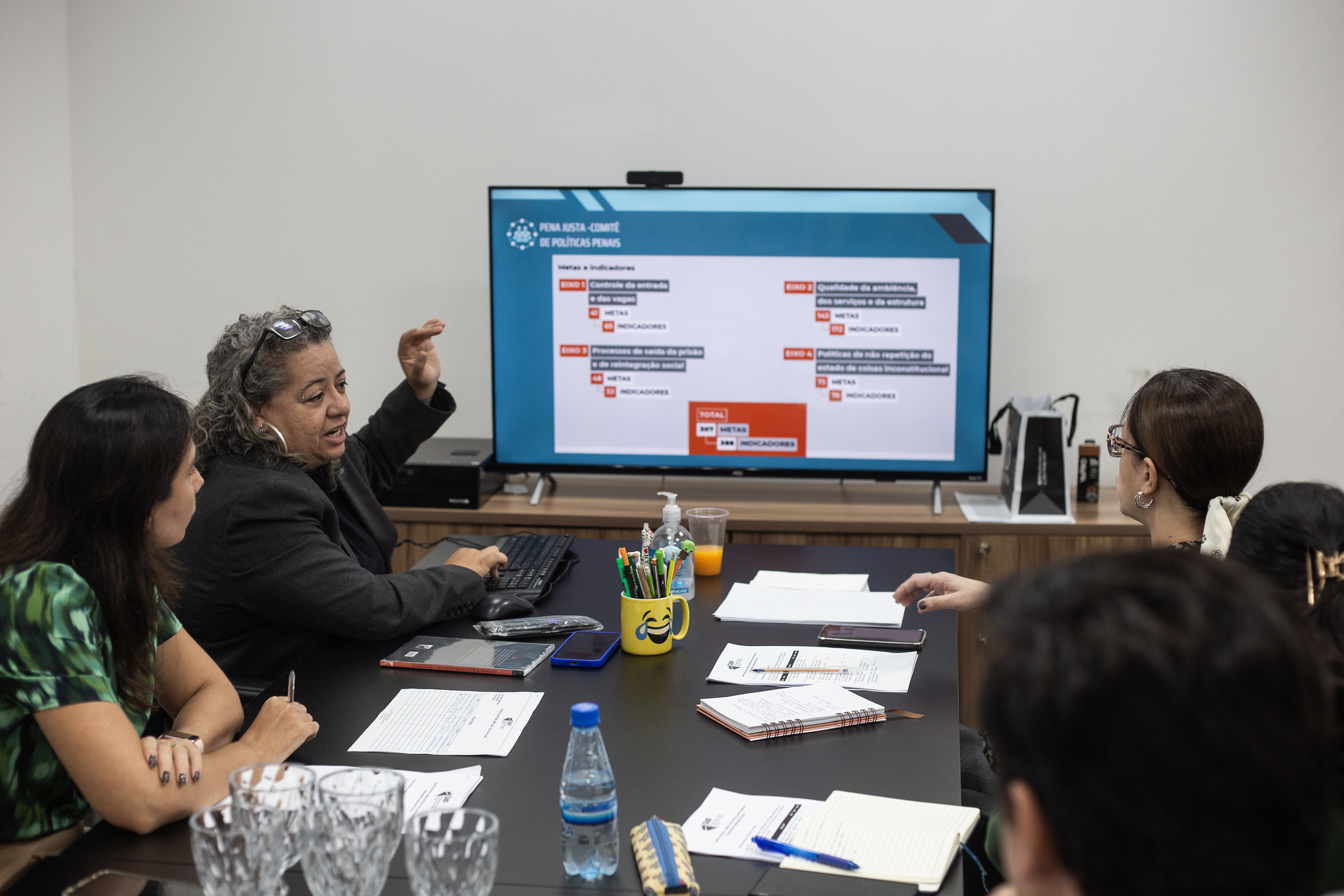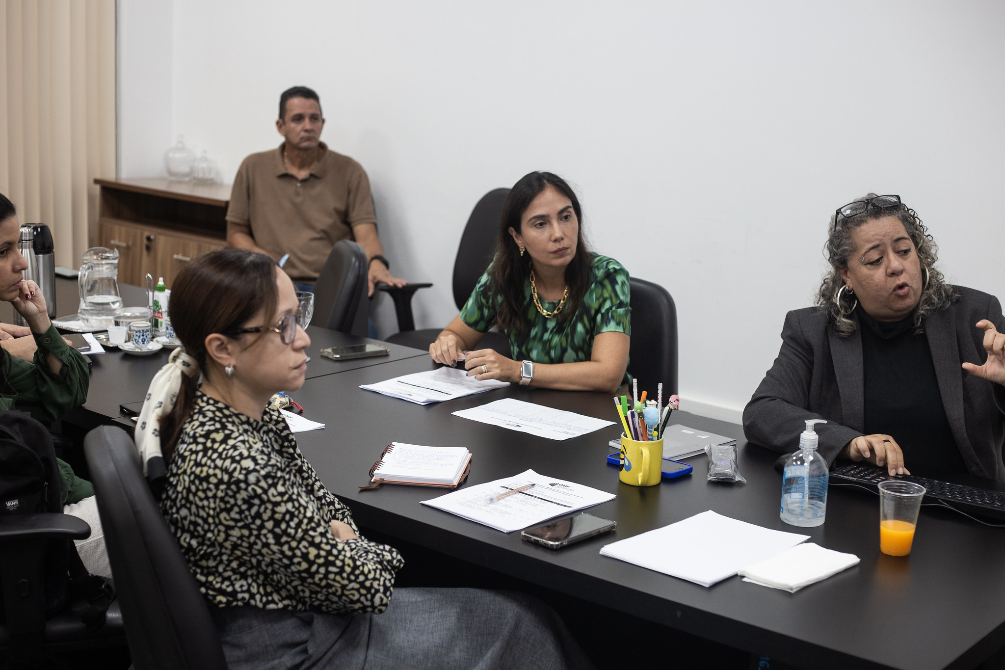 #PraTodosVerem: Imagem que ilustra a matéria traz a foto de cinco pessoas sentadas ao redor de uma mesa, entre elas a coordenadora do Grupo de Monitoramento e Fiscalização do Sistema Carcerário e Socioeducativo do Amazonas (GMF/TJAM), juíza Ana Paula de Medeiros Braga Bussulo (ao centro, vestida com roupa com detalhes nas cores verde e preta e com os cotovelos sobre a mesa). Fim da descrição