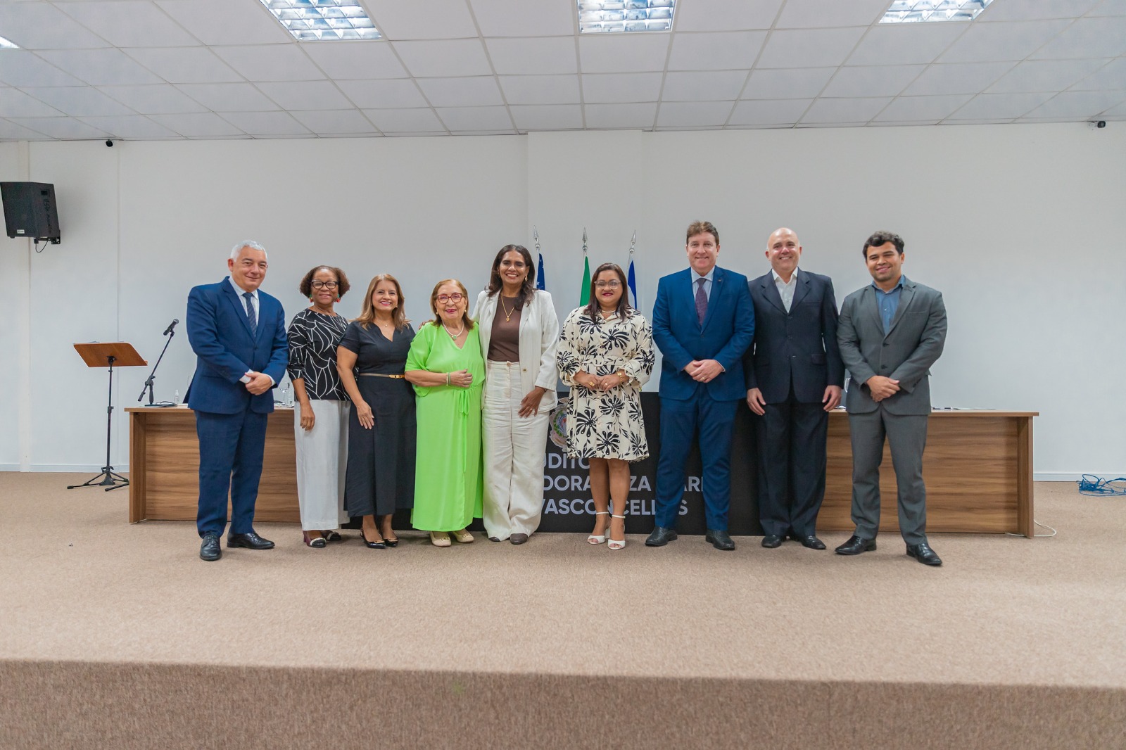 #PraTodosVerem: A imagem mostra a mesa de autoridades formada na abertura do evento, com três pessoas sentadas. Ao centro, está a desembargadora Joana Meirelles, que veste roupa verde clara e usa óculos. Ela fala ao microfone, sugerindo que está conduzindo ou fazendo uso da palavra durante a solenidade. À sua frente há um copo com água, e sua expressão é séria e concentrada. À esquerda, o presidente do Conselho Regional de Contabilidade do Amazonas, André Medeiros Caria, de cabelos grisalhos, usando terno escuro e óculos, olha para baixo. À direita, o delegado da Receita Federal, Eduardo Badaró Fernandes, também de terno escuro e gravata, observa atentamente a cena. Ao fundo, estão posicionadas bandeiras oficiais, incluindo a do Brasil e a do estado do Amazonas. Em primeiro plano, desfocados, aparecem de costas alguns participantes, que estão na plateia do auditório.