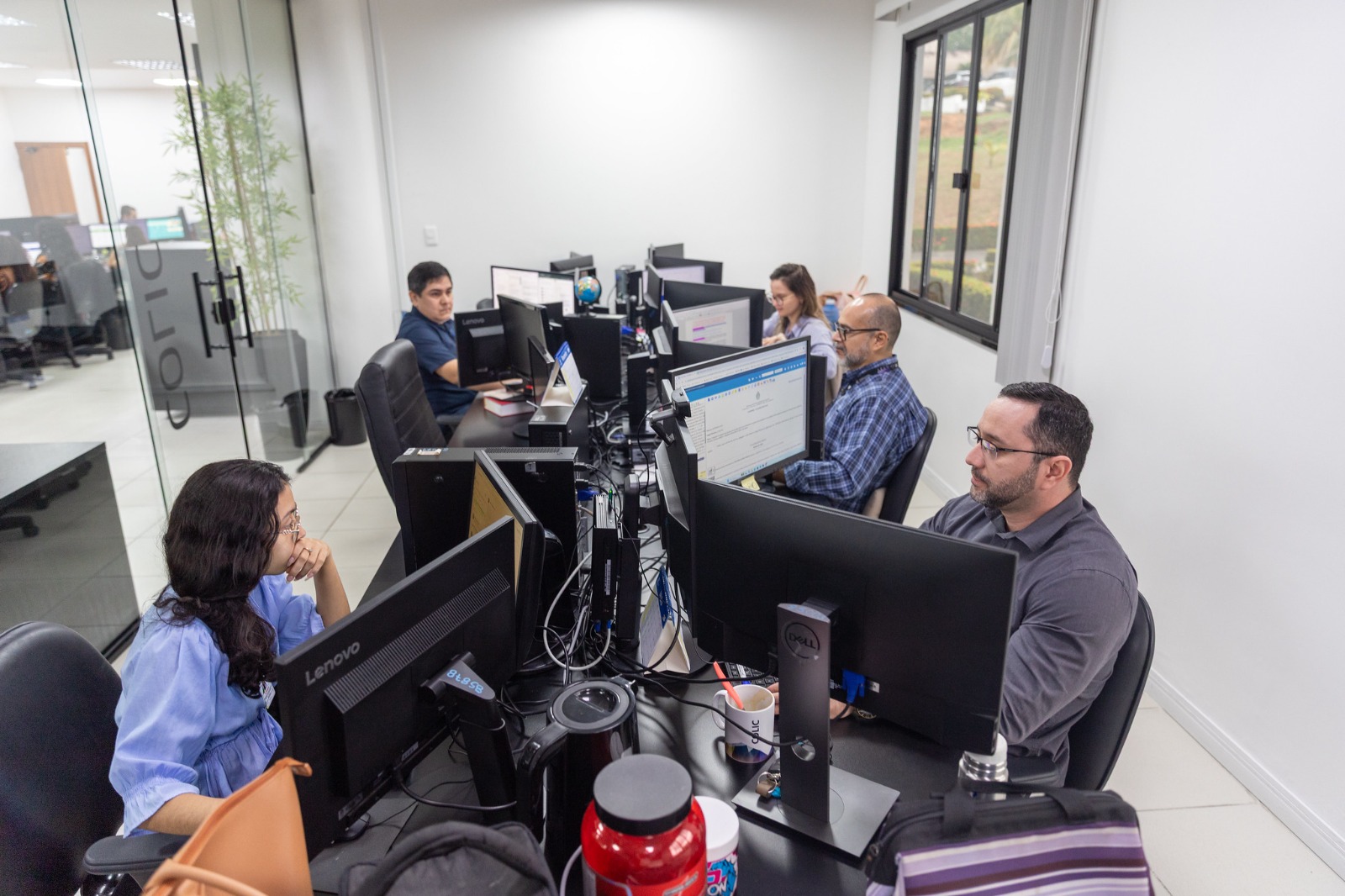 #PraTodosVerem: A imagem mostra um ambiente de escritório com várias pessoas trabalhando em computadores. Em primeiro plano, à direita, há uma mulher sentada diante de um monitor; ela aponta com a mão para a tela, indicando alguma informação. Ao lado dela, outra mulher, em pé e levemente inclinada para frente, observa atentamente o que está sendo mostrado no computador, com expressão concentrada. Mais à esquerda, outra mulher sentada também olha para um monitor, enquanto, ao fundo, outras pessoas trabalham em estações semelhantes. O ambiente é dividido por paredes de vidro, formando salas internas. Em uma das paredes ao fundo, há um quadro branco com anotações escritas à mão. Na parte inferior da imagem, aparecem folhas verdes de uma planta desfocada.