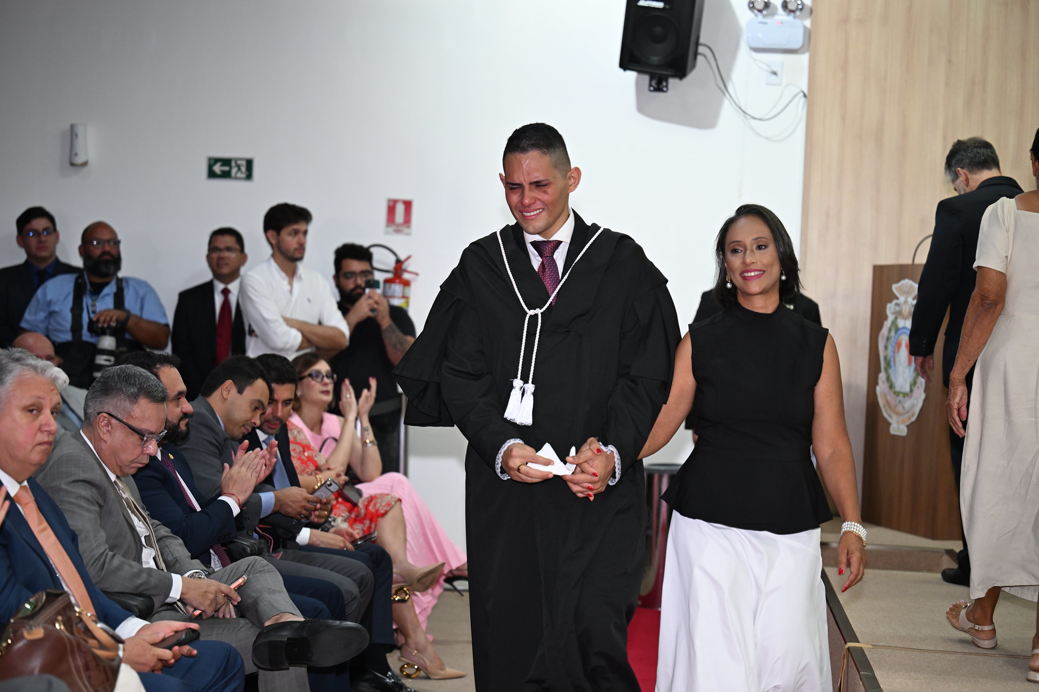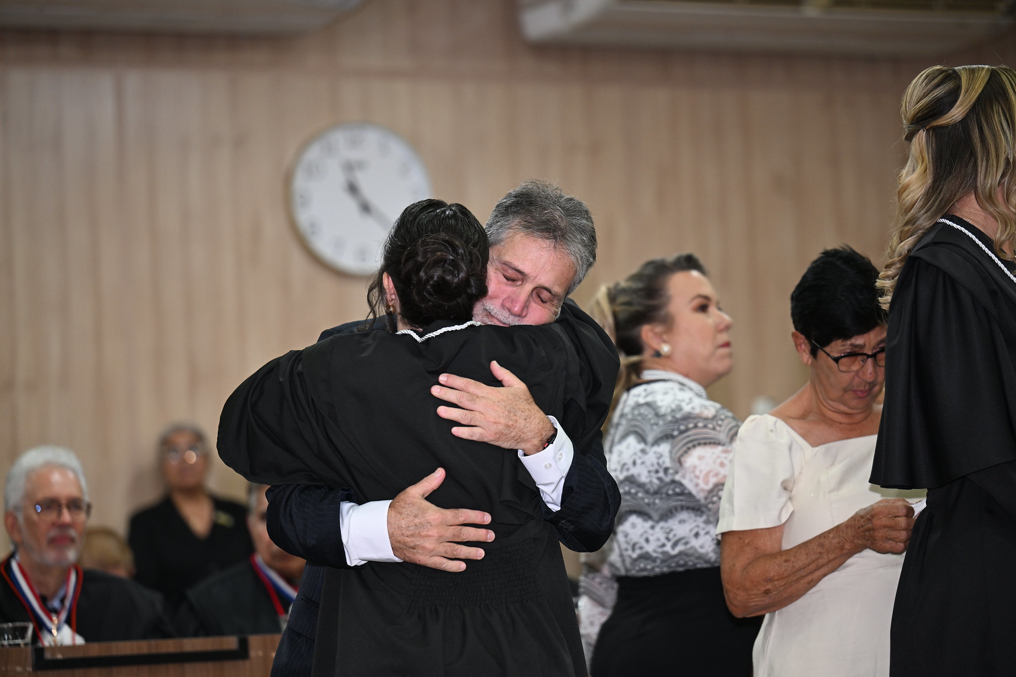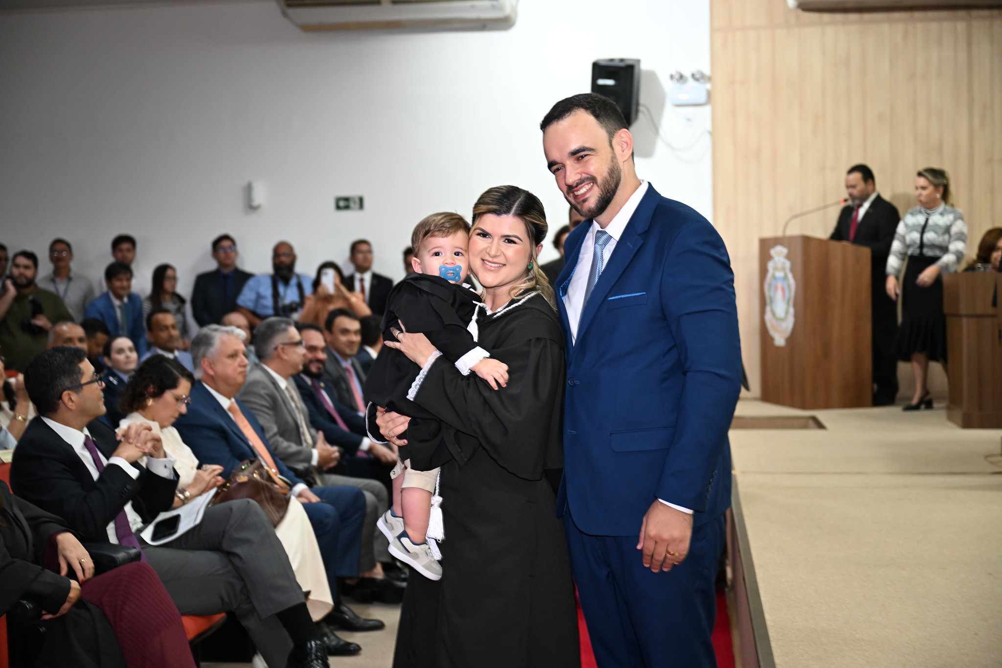 Após assinar o termo de posse e receber as vestes de juíza, Dálethe foi recebida pelo filho, que usava uma minitoga para homenagear a mãe.