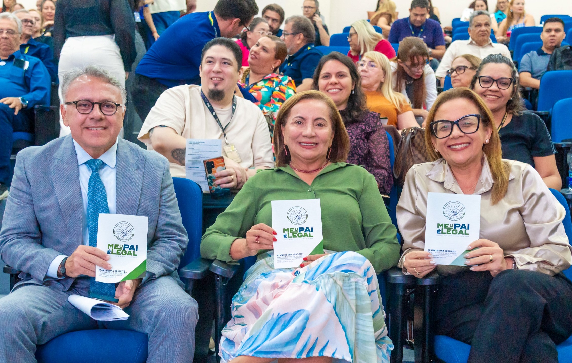 #PraTodosVerem - A imagem principal que ilustra a matéria mostra, em um auditório com cadeiras azuis, um grande grupo de pessoas reunidas e sorrindo para a foto, muitas delas segurando cartilhas com o título “Meu Pai é Legal”. Na parte da frente, estão autoridades e representantes institucionais, entre eles a desembargadora Socorro Guedes, ao lado do juiz Gildo Alves e da secretária Arlete Mendonça, todos com trajes formais. Ao fundo, o restante do grupo, composto por professores, pedagogos e gestores escolares, ocupa os degraus do auditório, também participando da foto. O ambiente é claro e bem iluminado, e a cena transmite um clima de organização, participação e engajamento em uma ação institucional. Fim da descrição.