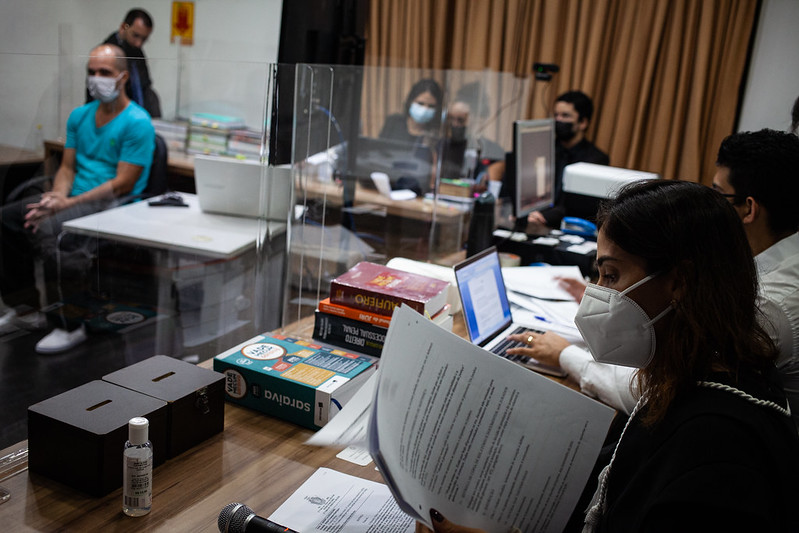 #PraCegoVer - a foto que ilustra a matéria mostra o plenário onde acontece o júri do "Caso Kimberly". Em primeiro plano, à direita, vê-se a juiza que preside a sessão. Ela está sentada, usa máscara, veste toga preta e manuseia alguns documentos. Também aparecem servidores que auxiliam os trabalhos na sessão de julgamento. Ao fundo, vê-se a imagem do réu, que usa caminha azul, calça cinza e tênis branco e está sentado em uma cadeira, ao centro do plenário. Ele também usa máscara de prevenção à covid-19.