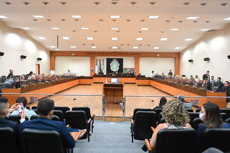 #PraTodosVerem - a foto que ilustra a matéria mostra uma visão geral do Plenário do TJAM durante a sessão desta quinta-feira. Algumas pessoas estão sentadas na plateia, enquanto os membros do colegiado ocupam suas cadeiras na bancada ao centro do recinto. Ao fundo, o presidente da Corte, des. Flávio Pascarelli conduz os trabalhos.